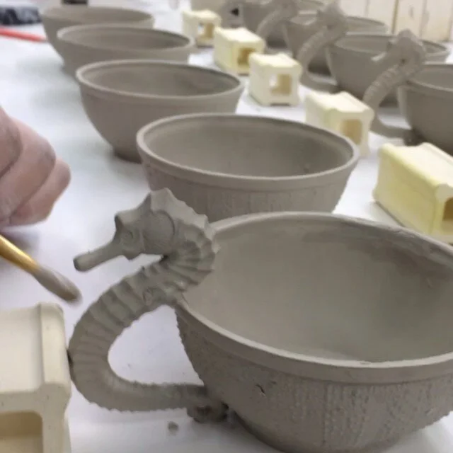 We were inspired to sustainably create heirloom quality plates, platters, bowls, teacups, teapots, and other functional tableware designs based on nautical, sea, and shell themes, including Seahorses, Clams, Sea Urchins, Starfish and other Shell designs. We hope you enjoy them as much as we enjoy the artistry of creating them for you!